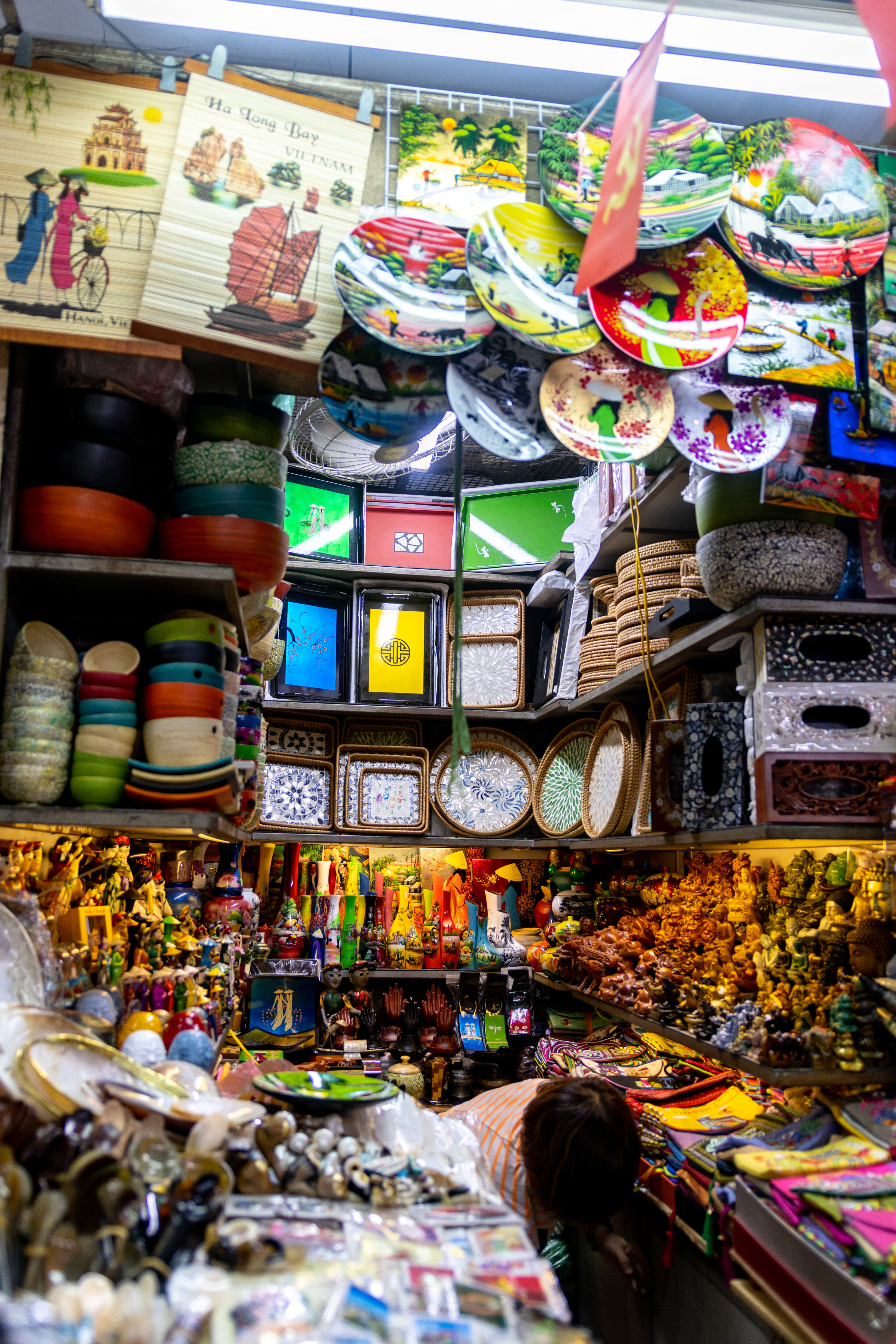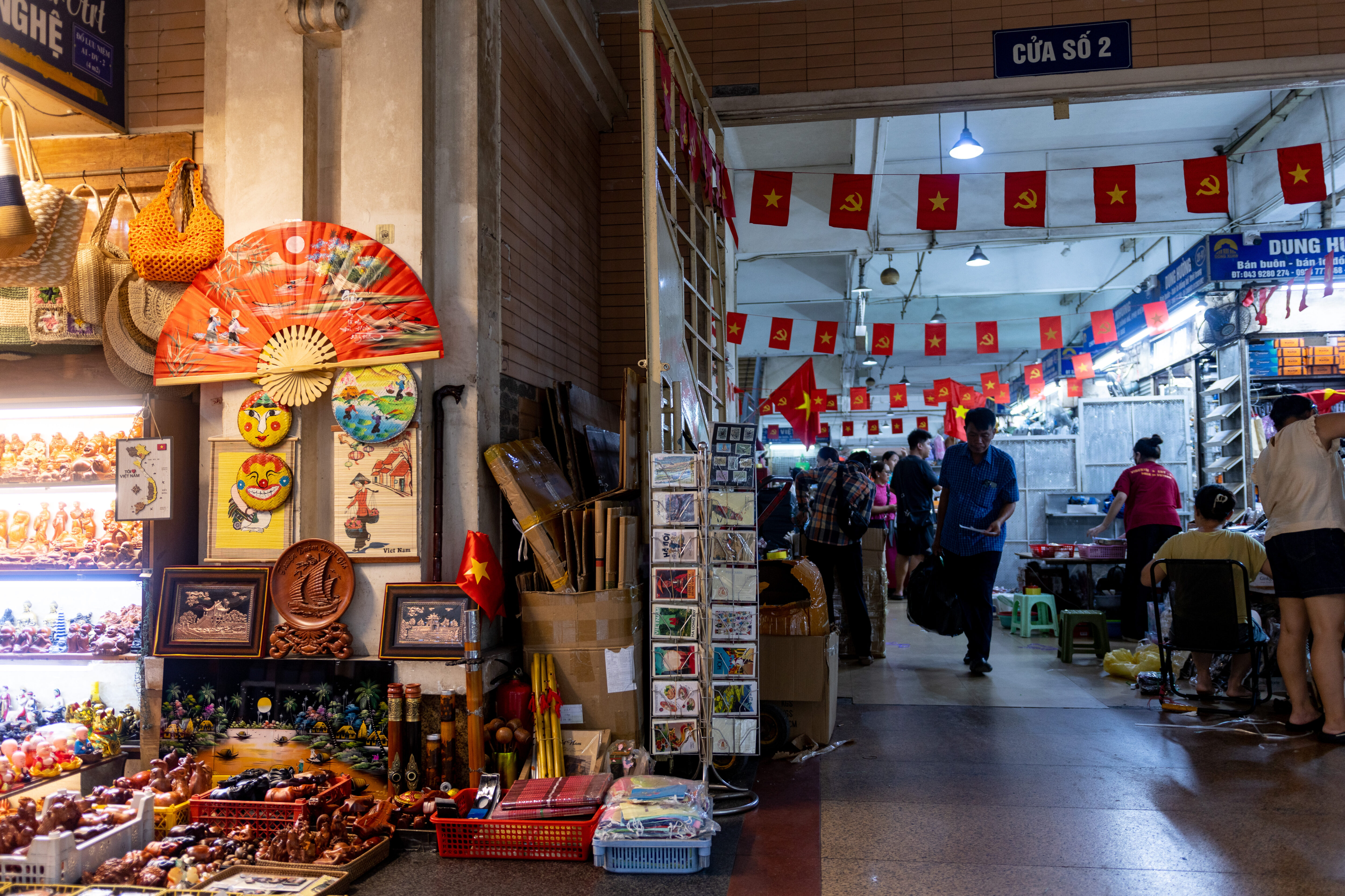 Le Đồng Xuân Market : un grand marché couvert avec de nombreux stands de vêtements, de souvenirs et de nourriture.